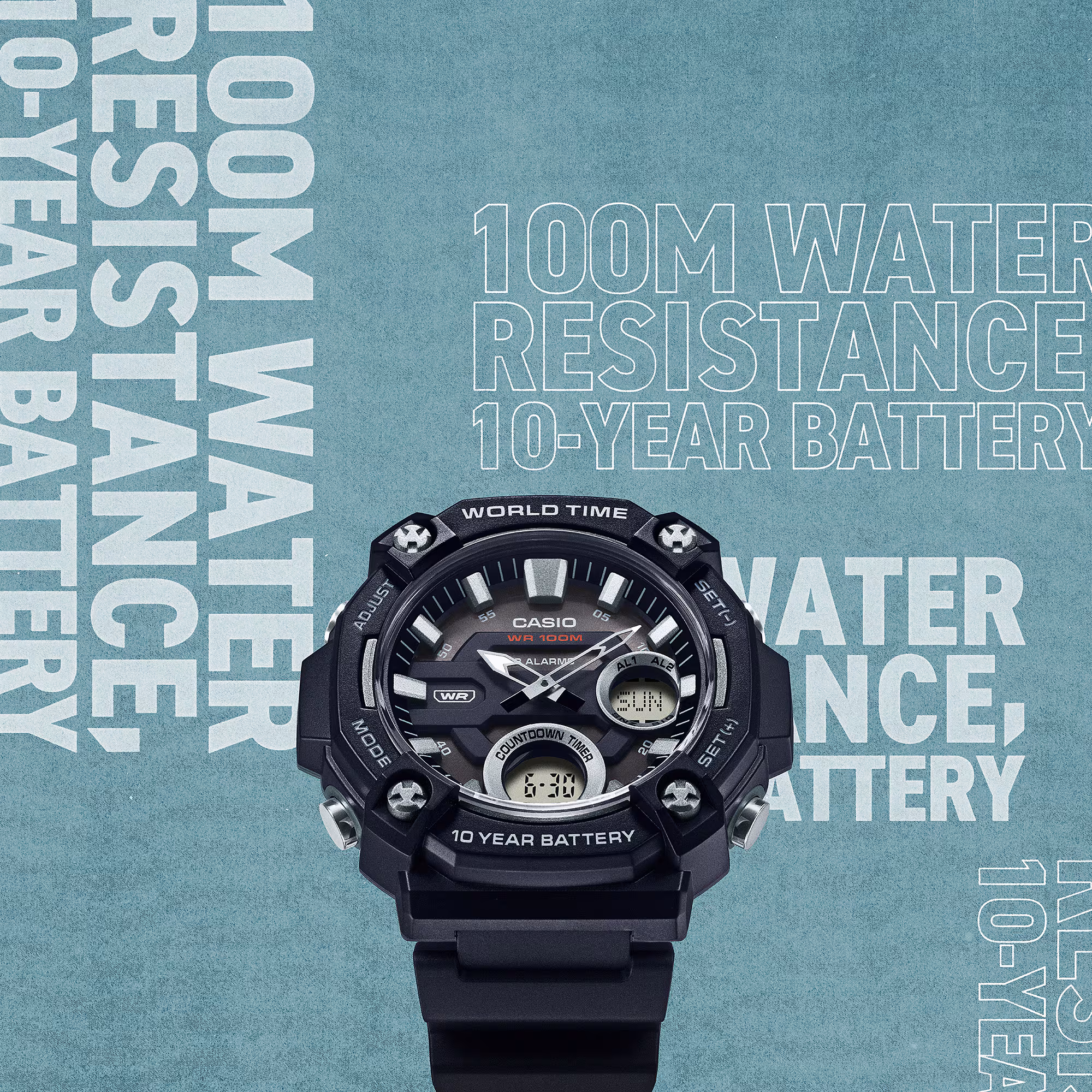 ساعت مچی آنالوگ دیجیتال کاسیو AEQ-120W-1AVDF با طراحی اسپرت مشکی، نمایش آنالوگ و دیجیتال همزمان، ساعت جهانی، کرنومتر، تایمر، آلارم و مقاومت 100 متری در برابر آب، انتخابی کاربردی برای استفاده روزمره و ورزشی است