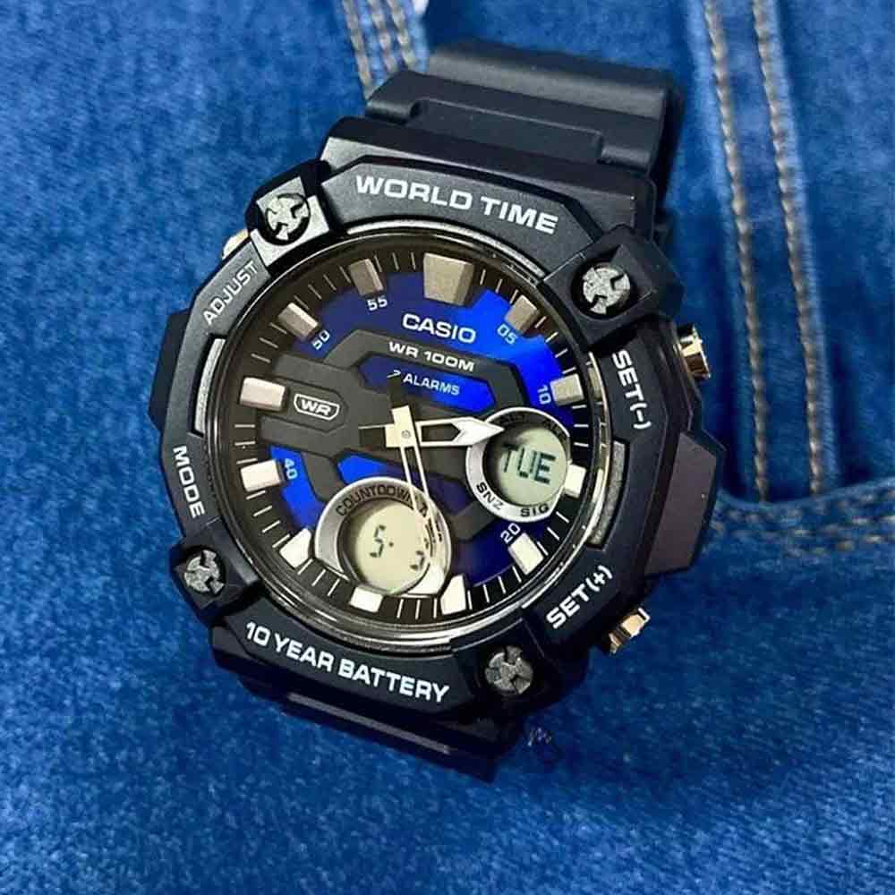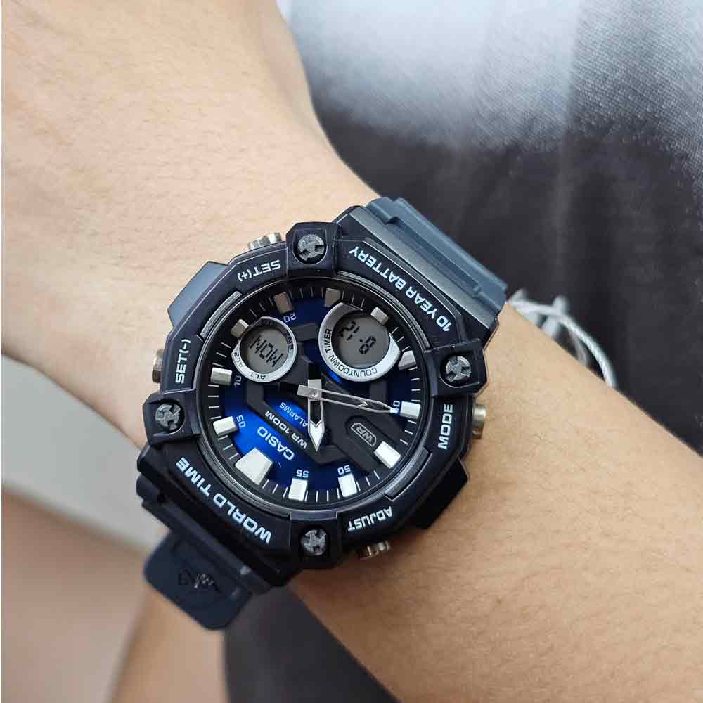 ساعت مچی آنالوگ دیجیتال کاسیو AEQ-120W-2A با نمایش همزمان آنالوگ و دیجیتال، ساعت جهانی، کرنومتر، تایمر، آلارم و مقاومت 100 متری در برابر آب، گزینهای کاربردی برای استفاده روزمره، ورزشی و سفر است.