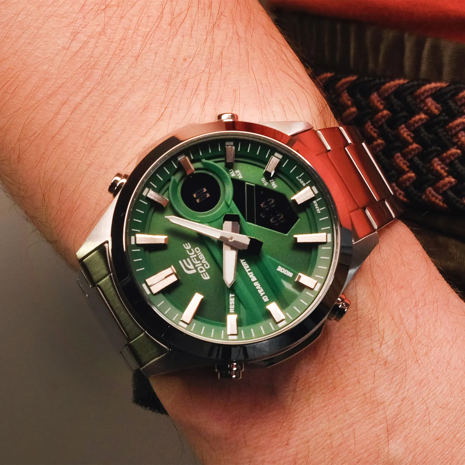 EFV-C120D-3A با صفحه نمایش سبز تیره یا زمردی خود، توجه هر بینندهای را جلب میکند. بند و قاب از جنس استیل ضد زنگ 316L ساخته شدهاند که علاوه بر دوام بالا، درخشندگی خود را در طول زمان حفظ میکنند. ترکیب نمایشگر آنالوگ و دیجیتال (دوزمانه) در این مدل، علاوه بر زیبایی، کاربری آسانی را برای تمام عملکردهای پیشرفته فراهم میکند.