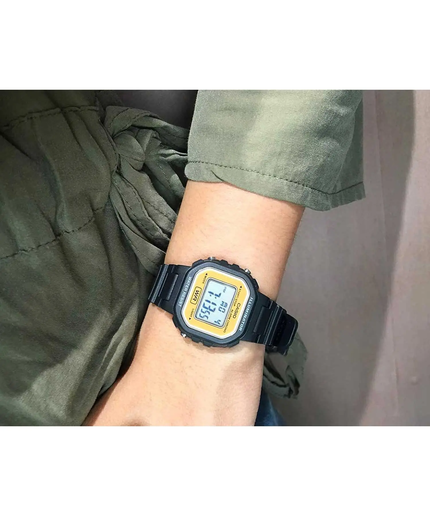 ساعت زنانه کاسیو LA-20WH-9ADF یک مدل دیجیتال سبک با بند و قاب مشکی و فریم زرد دور نمایشگر است که برای استفاده روزمره طراحی شده است.