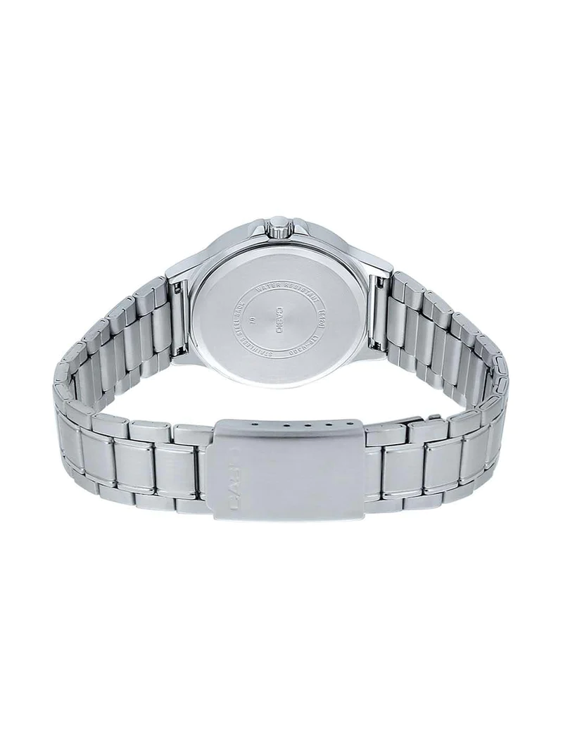 ساعت مچی زنانه کاسیو LTP-V300D-1A2UDF یک ساعت آنالوگ سه موتوره با صفحه نقرهای، نمایش ایام هفته، تاریخ ماه و فول تایم 24 ساعته است که طراحی ساده و کلاسیک دارد.