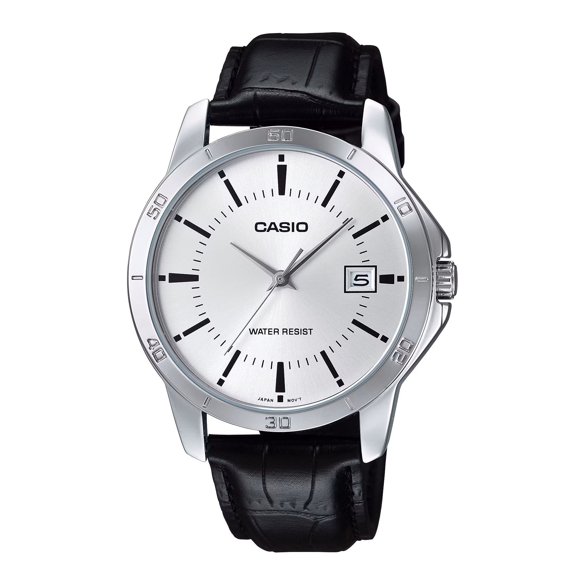 ساعت مچی مردانه کاسیو MTP V004L 7A با صفحه نقره ای، بند چرمی، شیشه معدنی و نمایش تاریخ، انتخابی ساده و کاربردی برای استفاده روزمره و رسمی است.