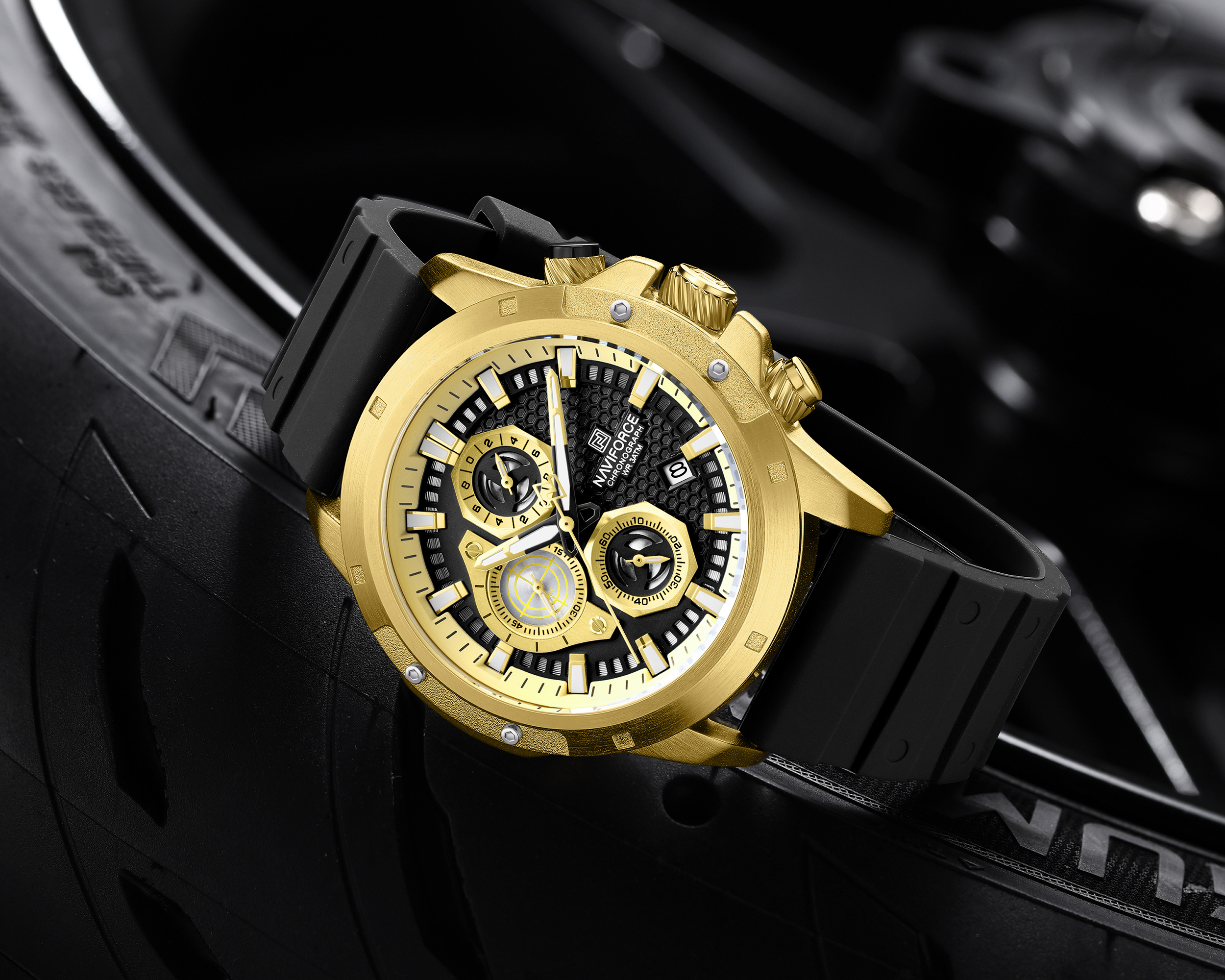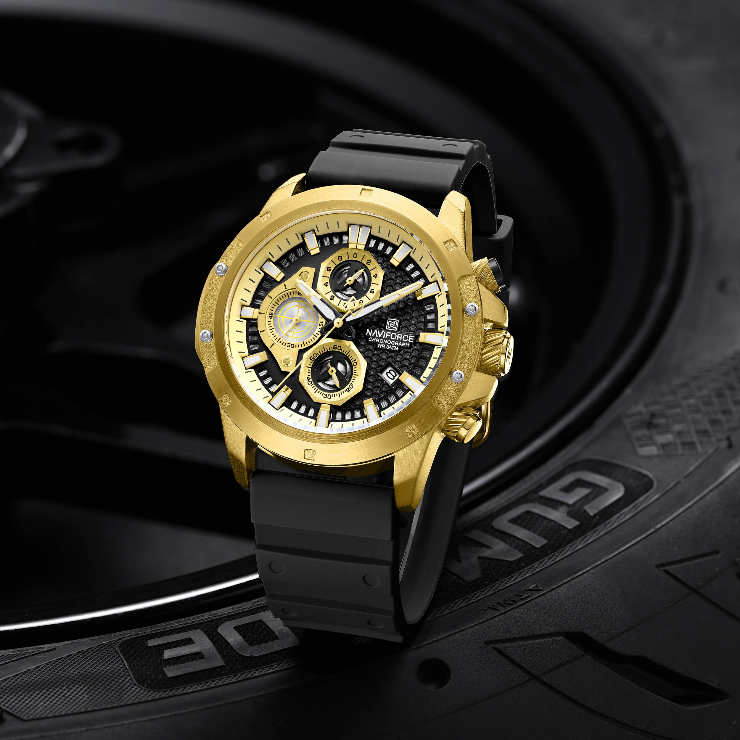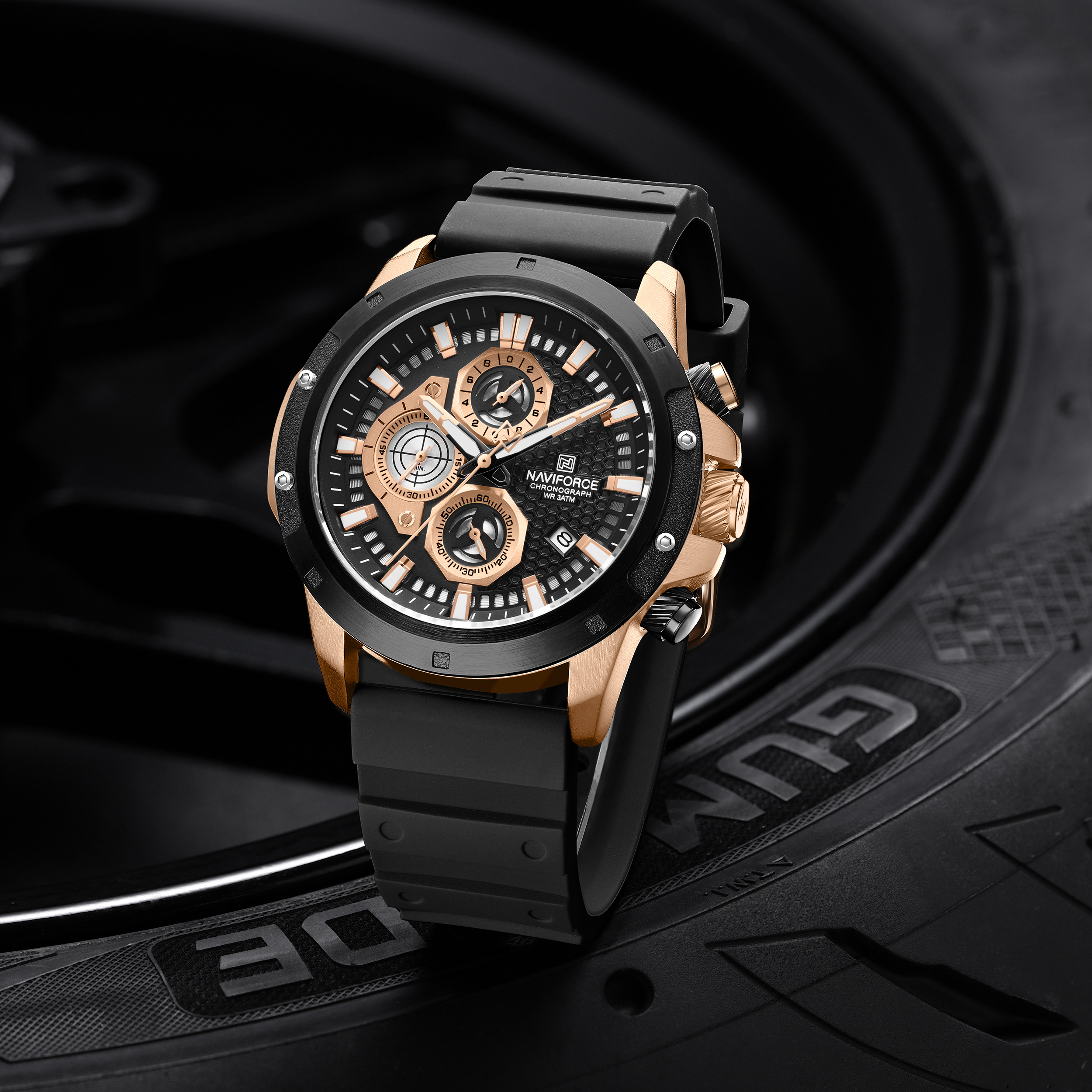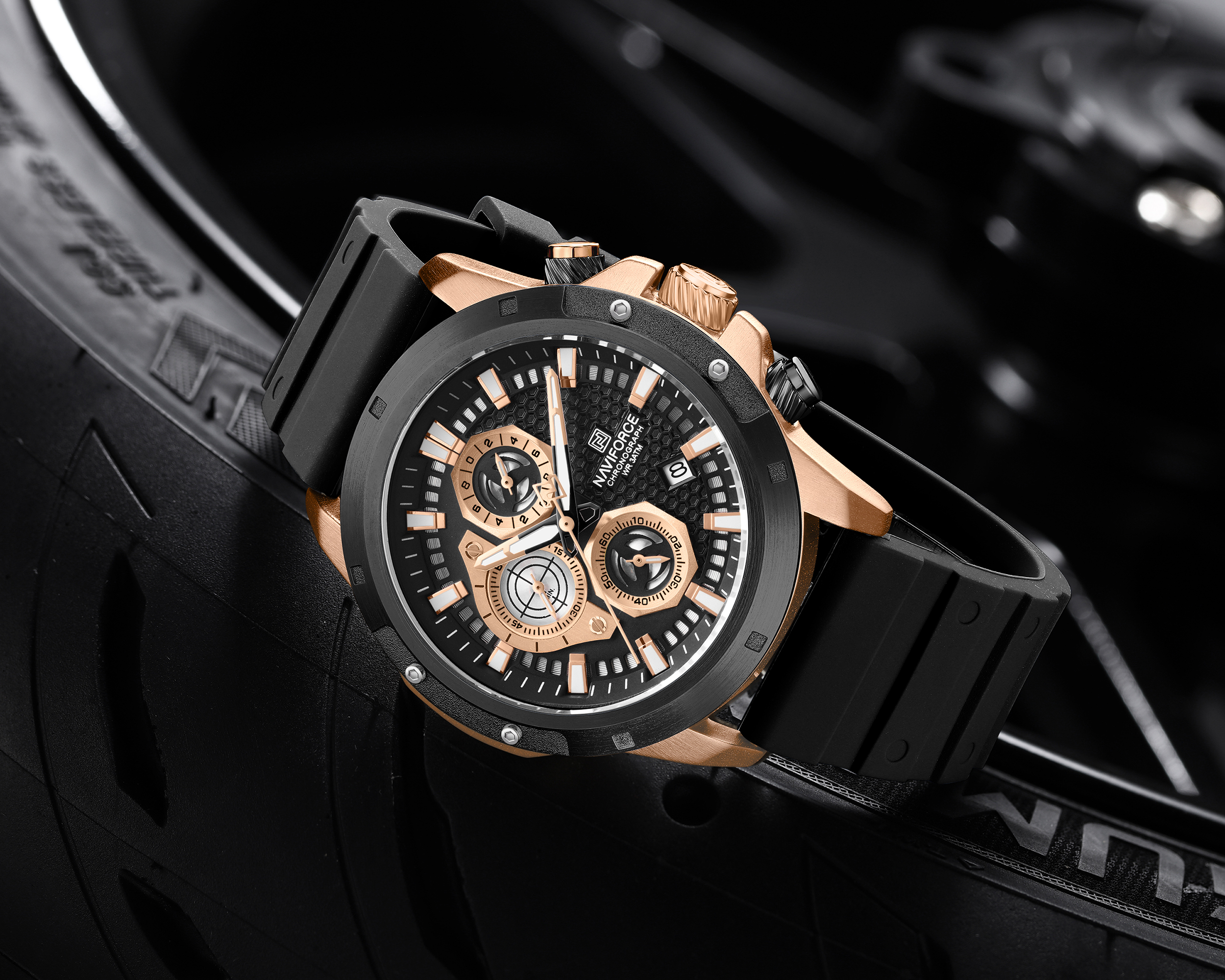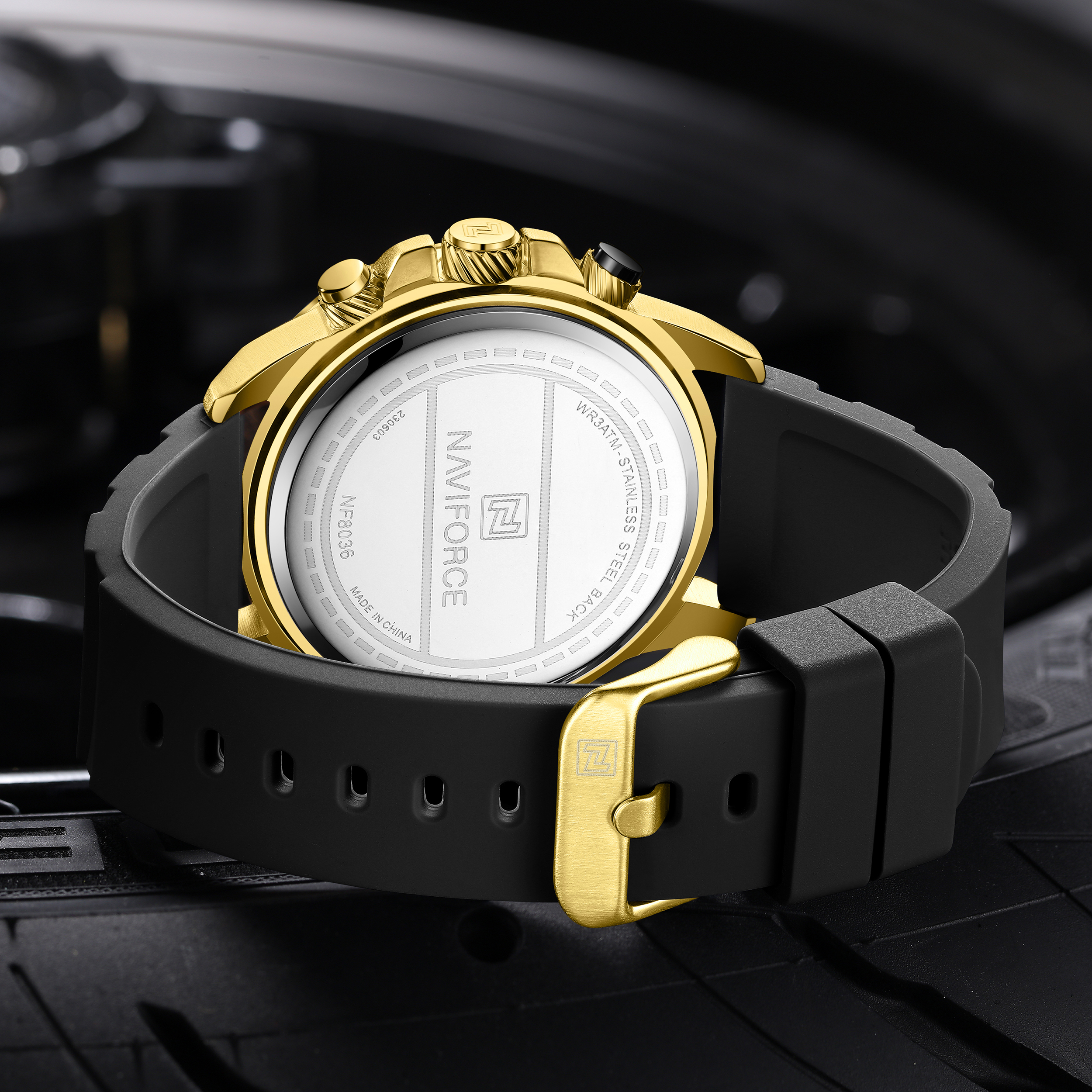 بدنهی برسخورده و خطوط برجسته: بدنهی این ساعت ناویفورس اسپرت با بافت برسخورده و خطوط برجسته طراحی شده است. این خطوط، ظاهری شبیه به جریان هوا اطراف یک خودروی مسابقهای ایجاد میکنند.