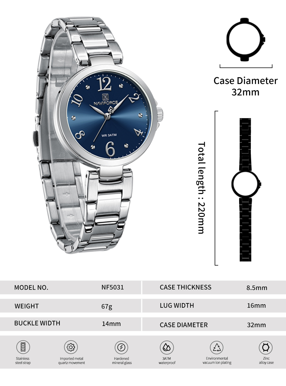 NAVIFORCE NF5031 یک مدل کوارتز استاندارد است که برای زنان شیک‌پوش طراحی شده است. این ساعت، سادگی کلاسیک را با سبکی پویا ترکیب می‌کند و یک اکسسوری ضروری برای استایل روزمره شماست. NF5031 انرژی تابستان را به مچ دست شما می‌آورد و ظرافت کژوال را تعریف می‌کند.