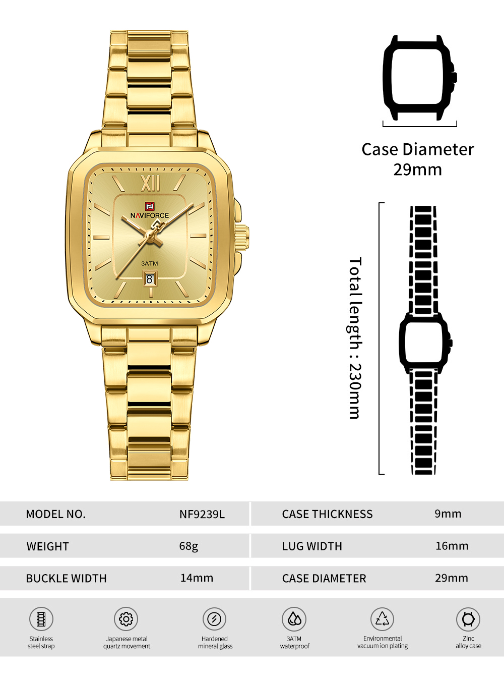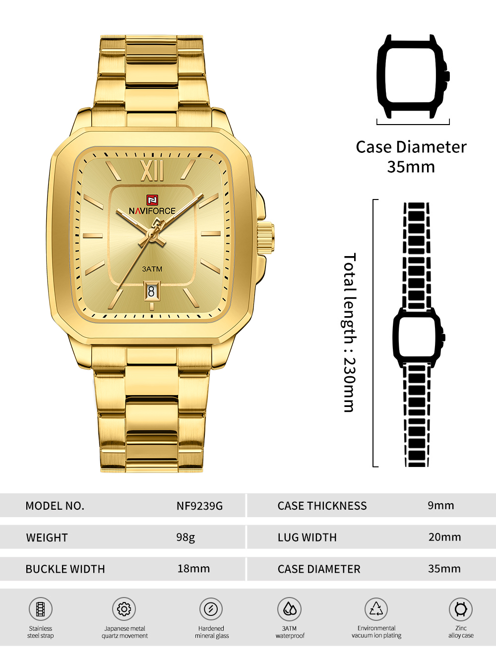 1. قاب مربعی مستحکم: ما برای NF9239 قابی مربعی و قوی در نظر گرفتیم. این فرم هندسی، استایلی متمایز و امروزی را به شما می‌بخشد. جنس قاب از فولاد ضد زنگ است که دوام و درخشش طولانی‌مدت ساعت را تضمین می‌کند.